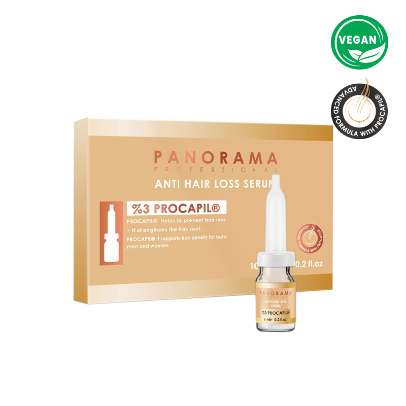 Panorama Professional’s serum ampoules for weak and limp hair prone to hair loss contain 3% PROCAPIL®. The patented substance PROCAPIL®, in addition to helping to strengthen and nourish hair follicles, helps prevent hair loss and supports the formation of new hair. The box contains 10 single-use ampoules of 6 ml.