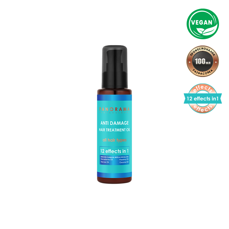 Panorama Professional Anti Damage Hair Treatment Oil nourishes and strengthens dull hair ends, prevents breakage and damage that can occur at the tips of the hair. Unique formula enriched with 4 special oils and 12 effects in 1. Professional packaging of 100ml.